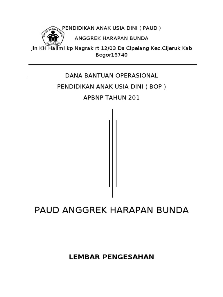Pendidikan Anak Usia Dini dan Pendidikan Kesetaraan Tahun Anggaran 2020 belum mengakomodir penggunaan dana untuk operasional pembelajaran dari rumah sehingga perlu diubah. Yang semua kita tahu bahwa spj bop paud atau contoh laporan bop paud yang dikerjakan pada laporan awal bop paud laporan pertanggungjawaban bop paud tersebut harus dibuat ... Format Laporan Penggunaan Dana BOP (Bantuan Operasional Penyelenggaraan) PAUD. Download File Format .docx Microsoft Word. Seperti kita ketahui bahwa Penggunaan dana BOP PAUD di Satuan PAUD atau Lembaga harus didasarkan pada Rencana Kerja Anggaran (RKA) PAUD yang telah disusun dengan memperhatikan komponen kegiatan-kegiatan seperti Kegiatan ... Berkas Contoh Format Laporan Penggunaan Dana BOP PAUD. Download file dalam format .docx Microsoft Word. Berkas ini mudah-mudahan berguna sebagai referensi ditujukan untuk Kepala PAUD atau Pengelola PAUD, Guru, dan pihak-pihak lain yang berkepentingan dengan pengelolaan dana BOP (Bantuan Operasional Penyelenggaraan) PAUD (Pendidikan Anak Usia Dini).