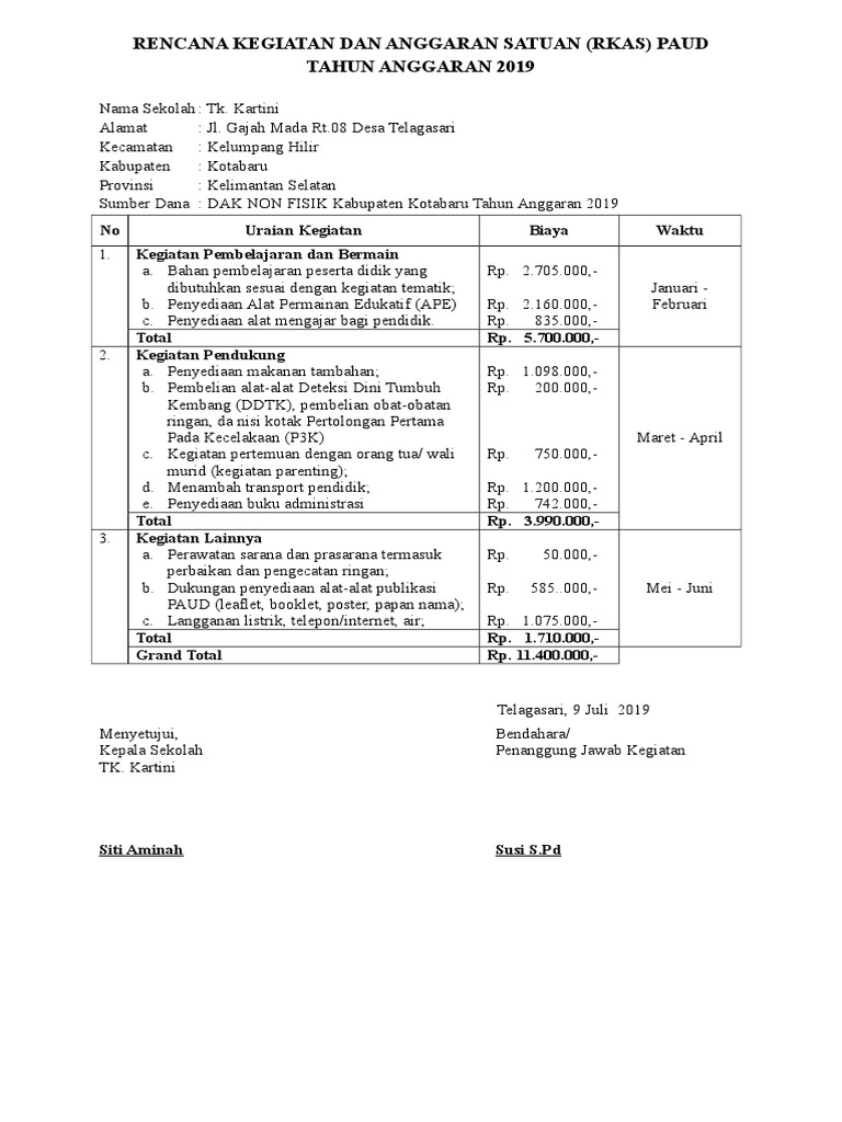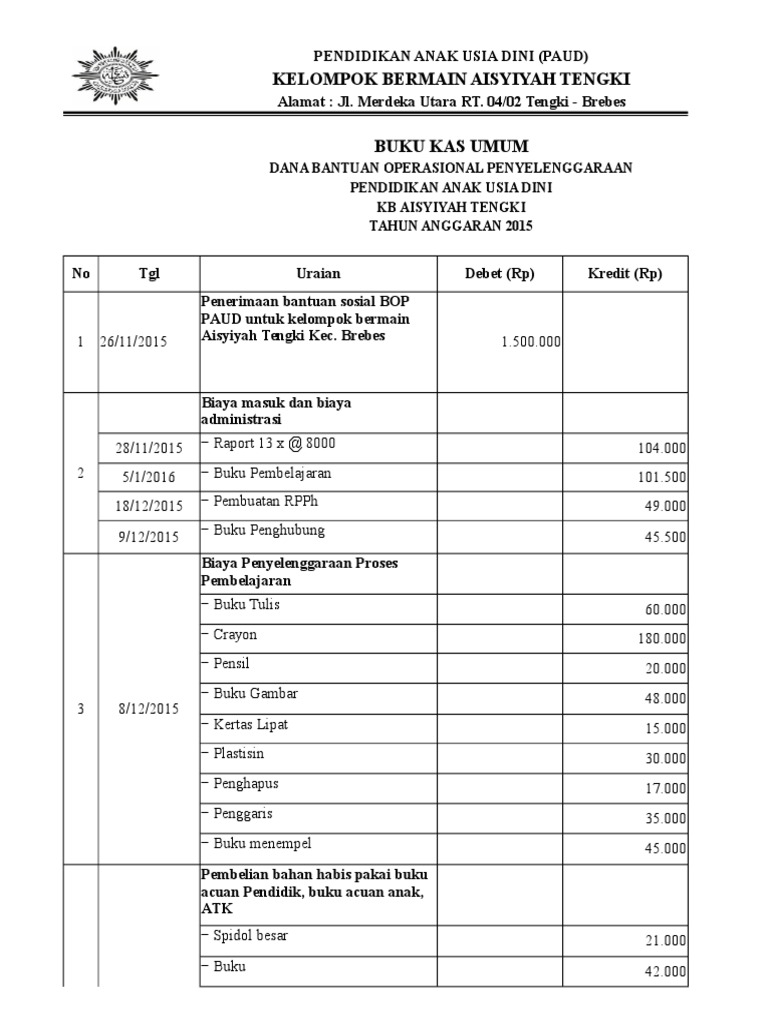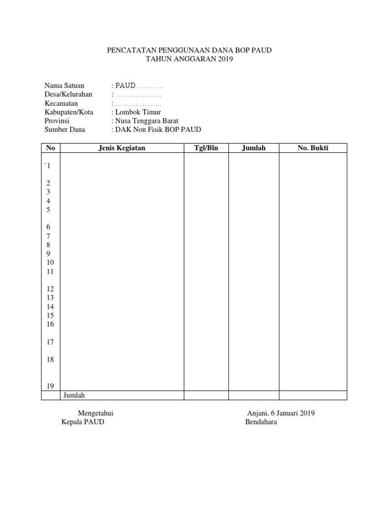 Contoh laporan penggunaan dana bop paud. Yang semua kita tahu bahwa spj bop paud atau contoh laporan bop paud yang dikerjakan pada laporan awal bop paud, laporan pertanggungjawaban bop paud tersebut harus dibuat secepat dan seakurat dengan disertai bukti fisik yang benar. Adapun contoh contoh dari pada spj dana bop paud yang saya bagikan ini dibuat dalam MS. Office Word, guna memudahkan anda dalam membuat laporan pertanggungjawaban ... Laporan penyerapan dak nonfisik bop paud tahun sebelumnya; Penggunaan dana bop paud a. Pergerakan dan sikap tubuh yang melibatkan otot otot besar contoh: 32 rt/rw 02/14 dsn cidewa dewasari kec. Dua orang instruktur memberikan contoh bagaimana melakukan pemeriksaan kpsp (misal usia. 10 Contoh Laporan Penggunaan Dana Bop Paud. Itulah isi dari contoh laporan akhir bop yang bisa kami tuangkan dalam laporan akhir tersebut untuk lebih jelasnya silahkan sobat download contoh laporan akhir bop di bawah ini. Contoh laporan pertanggung jawaban dana bop paud informasi. Sesuai dengan Permendikbud Nomor 4 Tahun 2017 tentang Juknis Penggunaan Dana Alokasi Khusus Non Fisik Bantuan Operasional Penyelenggaraan Pendidikan Anak Usia Dini (BOP-PAUD) bahwa setiap lembaga yang telah menerima Bantuan tersebut sudah seharusnya melaporkan penggunaannya berupa Laporan Pertanggung Jawaban (LPJ) Dana BOP-PAUD.