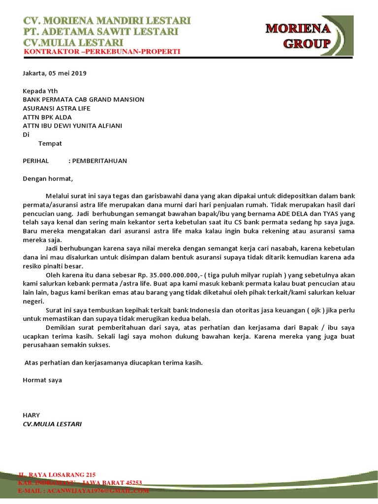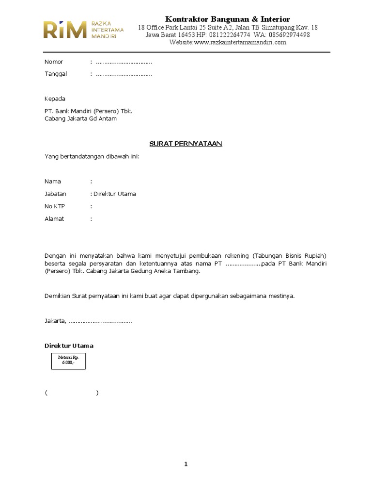 Kop surat bank mandiri. Berdasarkan Surat Keputusan Otoritas Jasa Keuangan (OJK), Kantor Fungsional Non Operasional (KNFO) beberapa Bank Mandiri Taspen berpindah lokasi ke alamat ... IBP, Inc. · 2007 · Business & EconomicsNama Bank : PT BANK NEGARA INDONESIA (Persero) Tbk Alamat Bank : Gedung BNI Jln. ... PT BANK MANDIRI (Persero) Tbk Bank Address : Plaza Mandiri Jln. Jend. 31 Mar 2016 — ... Sharia Certificates of Bank Indonesia (SBIS), Surat Perbendaharaan Negara ... Details of outstanding buy and sell foreign currency spot ... Kop Surat Bank Mandiri. 0; 0. December 2019; PDF TXT. Bookmark; Embed; Share; Print. SAVE THIS DOCUMENT. This document was uploaded by user and they ...