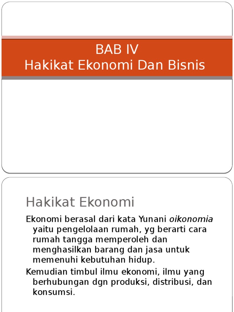 Hakikat Ekonomi & Bisnis - ppt download - SlidePlayer HAKIKAT EKONOMI Ekonomi berasal dari kata Yunani oikonomia yang berarti pengelolaan rumah (Capra,2002). Yang dimaksud dengan pengelolaan rumah yaitu cara ...