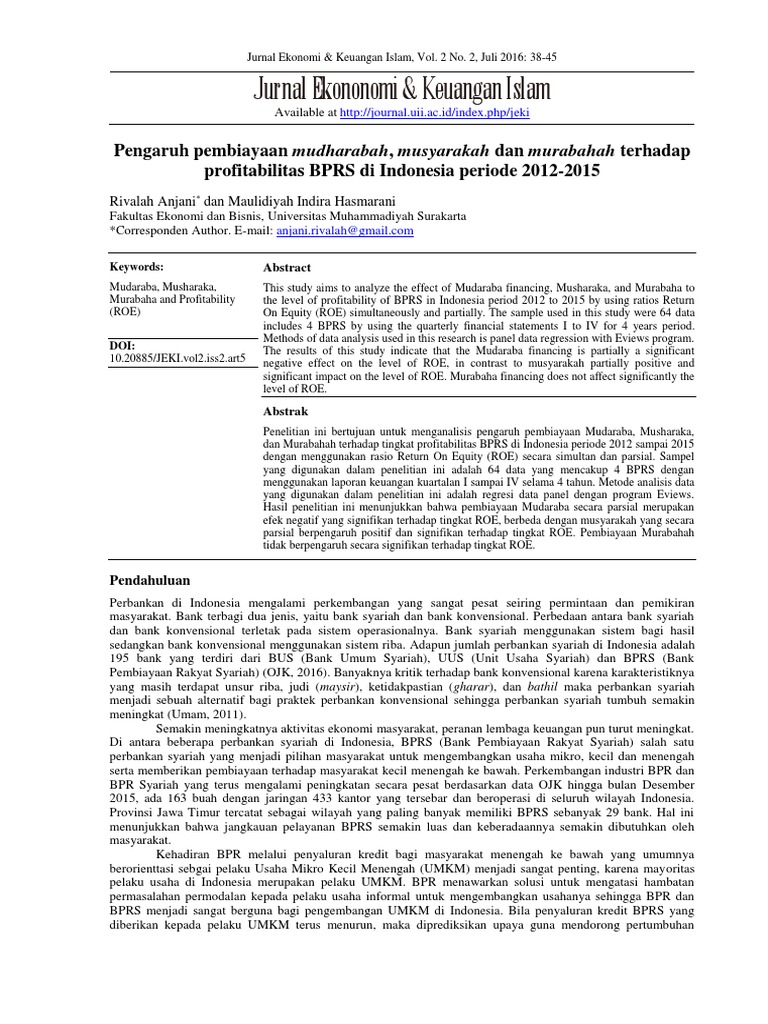 PDF Pengaruh Pembiayaan Qardh, Ijarah dan Istishna terhadap Profitabilitas profitabilitas bank pembiayaan rakyat syariah. terhadap profitabilitas bank pemiayaan rakyat syariah digunakan teknik analisis regresi linier. berganda dengan metode Error Correction Model (ECM). PDF Jurnal Terhadap Profitabilitas Bank. Umum Syariah Di Indonesia. ISSN: 2252-6765, Accounting. Analysis Journal 3. Universitas. produktif dan Net Capital. Terhadap Profitabilitas Bank. Syariah.Skripsi S1 Program Studi. Akuntansi. Universitas. Analisis faktor-faktor yang mempengaruhi pembiayaan modal kerja... PDF. 2001. Bank Syariah Dari Teori Ke Praktik. Jakarta: Gema Insani. Dinan Izzan Abshari, Fatin Fadhilah Hasib, FAKTOR YANG MEMPENGARUHI DANA DEPOSITO BANK UMUM SYARIAH DI INDONESIA TAHUN 2010-2015 , NISBAH: JURNAL PERBANKAN SYARIAH: Vol. 4 No. 1 (2018)...