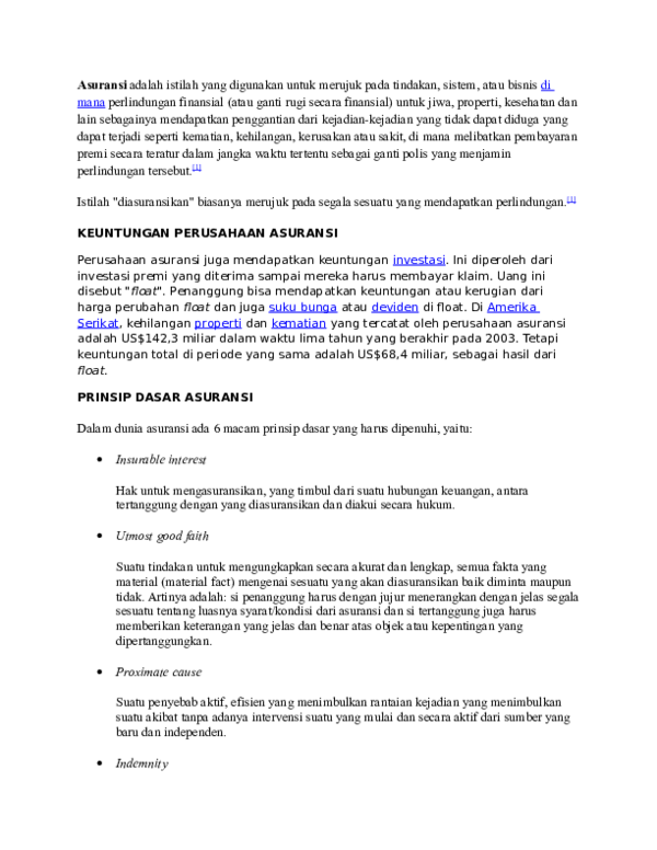 Prinsip Umum Asuransi - Kompasiana.com Secara umum, di dalam asuransi dikenal adanya prinsip-prinsip sebagai berikut : 1.Prinsip iktikad baik Istilah iktikad baik atau goed trouw atau utmost good faith berarti kemauan baik dari setiap pihak untuk melakukan perbuatan hukum agar akibat dari kehendak/perbuatan hukum itu dapat tercapai dengan baik. Prinsip-Prinsip Asuransi - PusatAsuransi.com Berdasarkan prinsip ini orang yang berhak mengasuransikan adalah pihak yang memiliki kepentingan (keuangan) terhadap objek yang dipertanggungkan. Prinsip ini mempertegas bahwa orang yang tidak memiliki kepentingan terhadap objek yang diasuransikan tidak dapat mengklaim apabila terjadi kerugian terhadap objek tersebut. Tidak untuk mencari laba